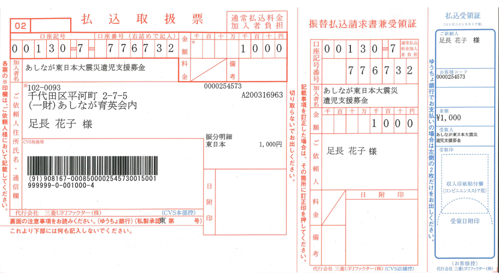 加入者名と口座記号番号で「あしなが東日本大震災遺児支援募金」を指定している振込用紙は、2026年4月1日以降、受付不可となります。コンビニエンスストアからのお振込自体は可能ですが、「東日本大震災遺児支援募金」としては受付できなくなり、「あしなが育英会の活動全般」へのご寄付として受領させていただきます。