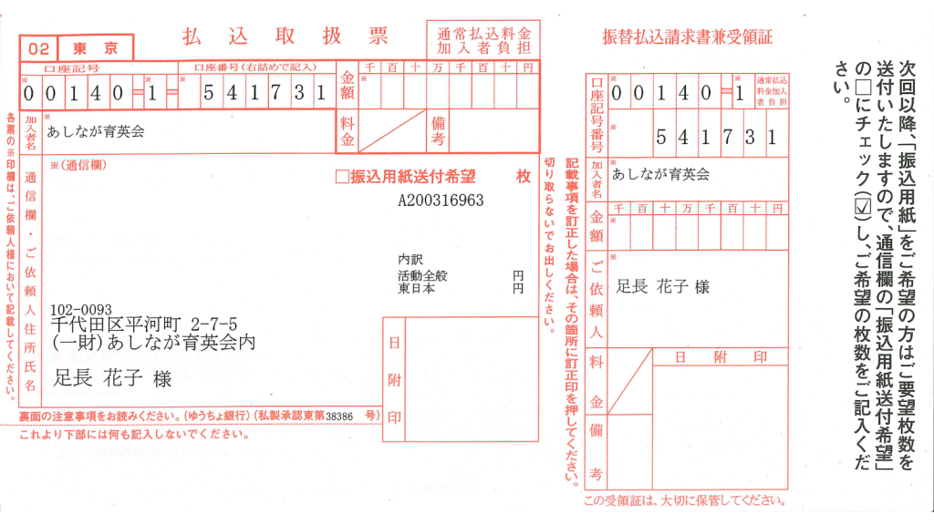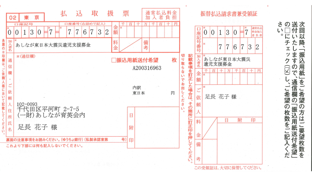 加入者名と口座記号番号で「あしなが東日本大震災遺児支援募金」を指定している振込用紙は、2026年4月1日以降、受付不可となります。