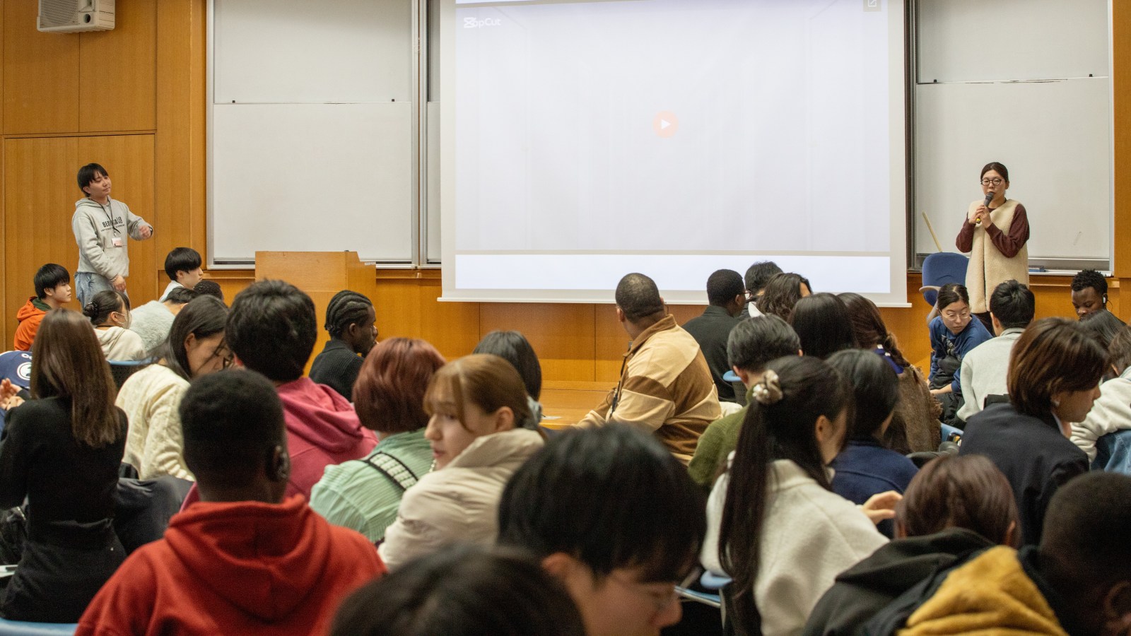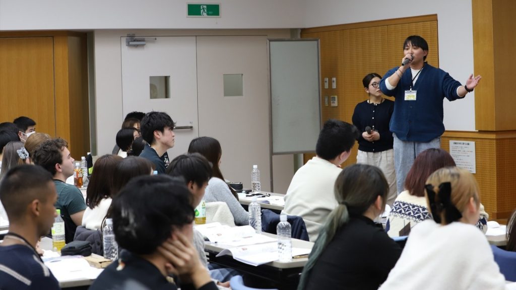 開会式では議長団(全体の司会進行役)の太田さんと小﨑さん(写真)が挨拶。太田さんは「みなさんの到着を心待ちにしていました。4日間を絶対にいいものにするので、楽しんでいきましょう!」と歓迎