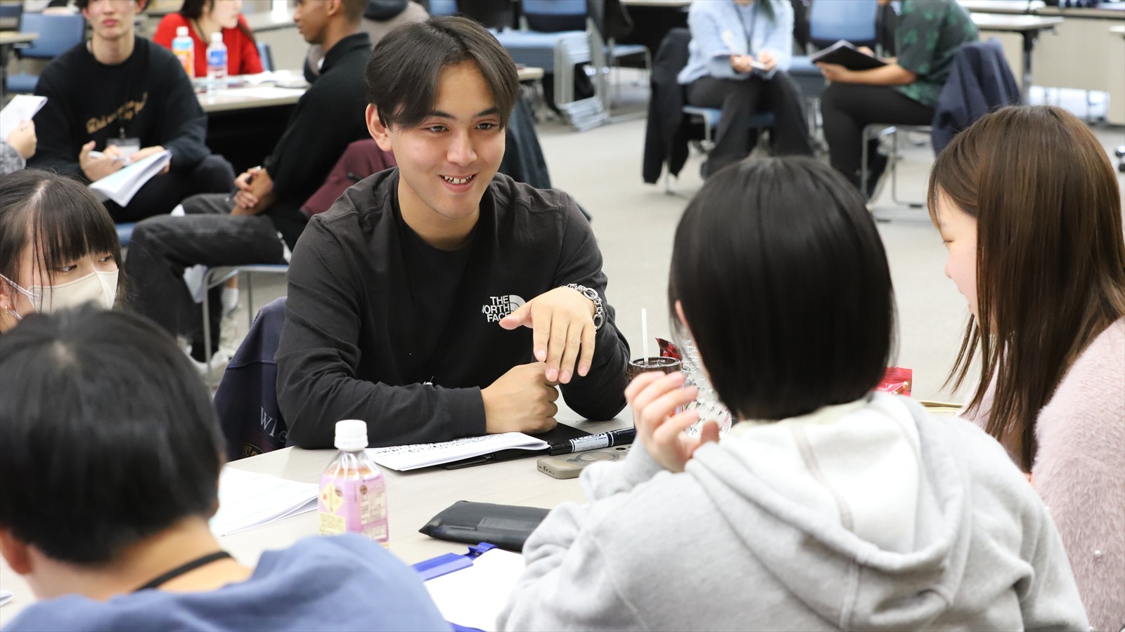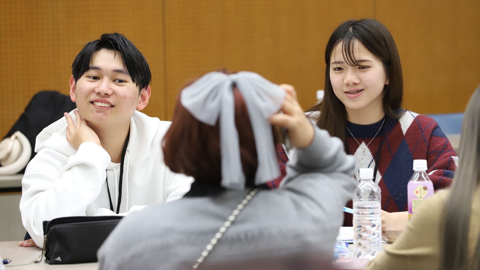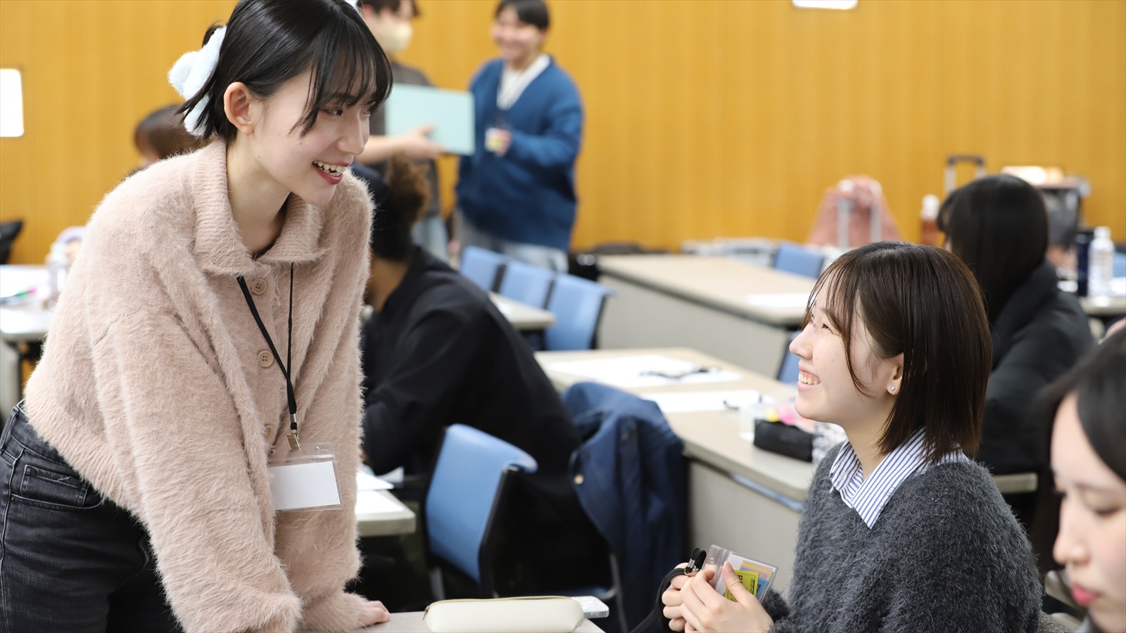 会場に到着したばかりの参加者(右)の緊張をほぐそうと、上級生リーダーが声をかける
