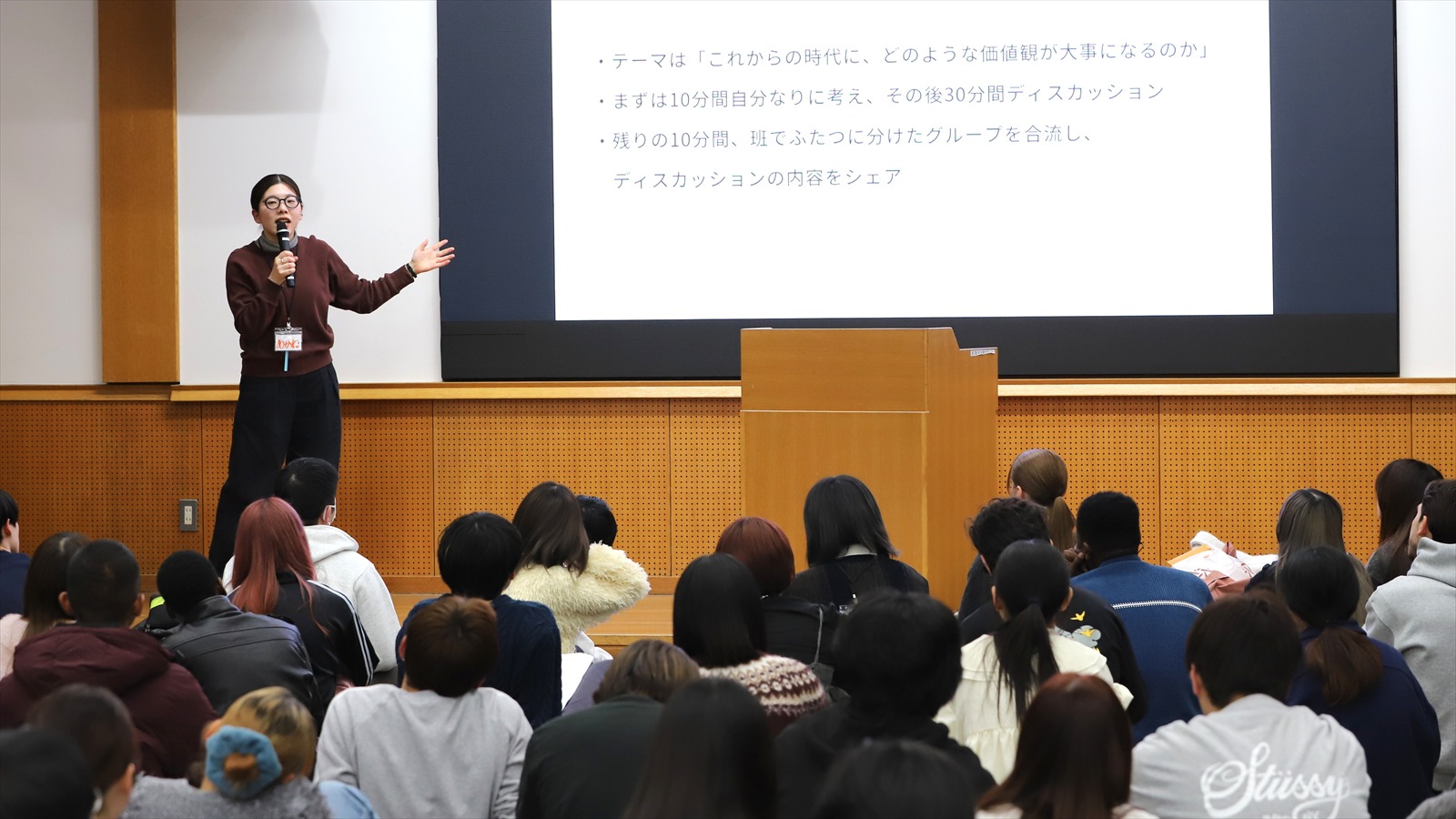 プログラム「これからの時代を考える」の導入説明をする、議長団の太田さん。社会の変化に目を向け、自分なりの行動指針を見出すことがプロクラムの目的だ