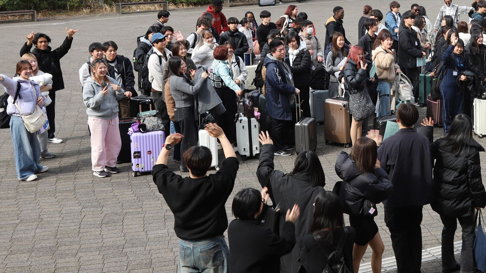 上級生スタッフ(手前)に手を振って見送られ、参加者たちは家路へ。再会を約束し合い、つどいは幕を閉じた