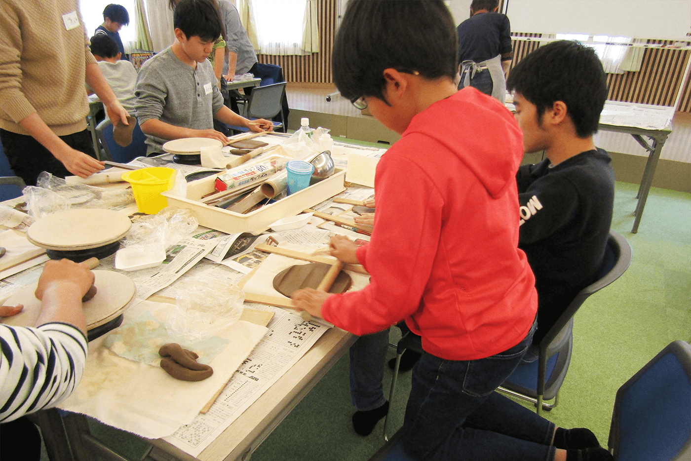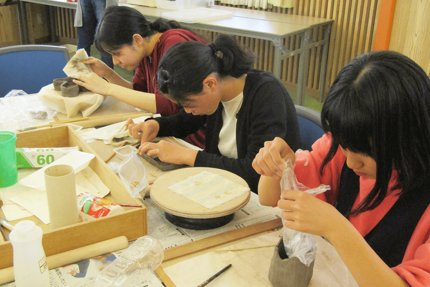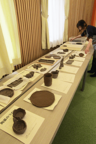 今回も、長年ご支援いただいている陶芸作家の先生にご指導いただきました。低学年の子ども達も熱心に作り方の説明を聞き、皆思い思いの作品を作りました。お皿、コップ、動物の置き物など個性溢れる作品が並びました。