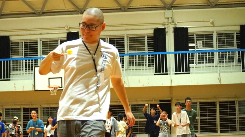 集合初日は「ウェルカムフェスタ」を開催しました。「班対抗リレー」では3種目が用意され、細長いバルーンを軸にぐるぐる回転してから走るリレー、ピンポン玉リレー、身体に巻きつけた新聞紙が落ちないように全力疾走するリレーで大いに盛り上がりました。